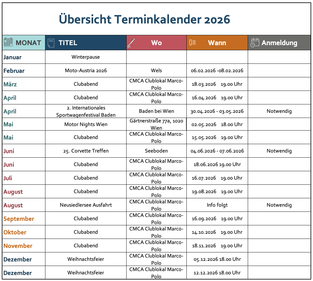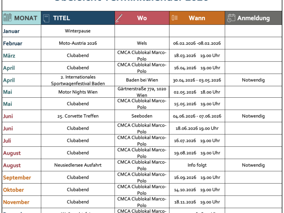 Der CMCA von den Gründungsmitgliedern Gerhard Jörg (Gründer des Corvette Club Austria) Rennfahrer und Tuningexperte und Ing. Kurt Zöchling aus der Taufe gehoben.
